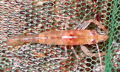 Main Identification Features: Rostrum nearly horizontal straight; antennal flagella reddish brown. Rostral crest slightly to moderately elevated in males but broadly triangular in large females. Third maxilliped of males with distal segment as long as second segment. Body semi-translucent, somewhat yellowish white in small specimens to pinkish in large specimens and covered with numerous minute dark brown dots (dots becoming obscure in large specimens). Antennal flagella (long whisker) reddish brown. Distal part of uropods yellowish with red margins.